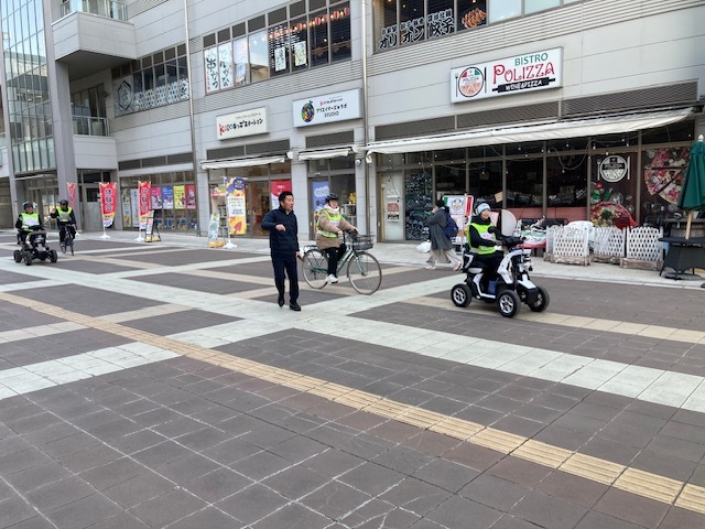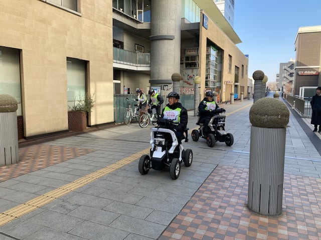 パーソナルモビリティの最高速度は時速6kmですが、今回の実証では時速10kmで走行するパーソナルモビリティにデジタル保安要員(*)を装備し、歩行者や自転車と協調して安全に走行できることを証明するための実証実験を行いました。