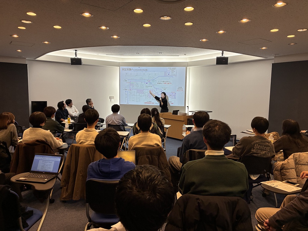 第3エリアスマートキャンパスプロジェクトでは、この約1年の間にプレイスメイキングのための三度の学⽣ワークショップや⾃転⾞利⽤環境の変更を伴う滞在空間形成の社会実験などを⾏いながら、キャンパス利⽤者の評価・滞在⾏動の特徴・⾃転⾞利⽤実態の把握等の定量評価を進めてきました。2026年2月10日に成果報告会を行い、これらの研究成果を含めて社会実験の成果を報告するとともに、第3エリアの滞在空間・⾃転⾞利⽤のこれからの姿を議論しました。